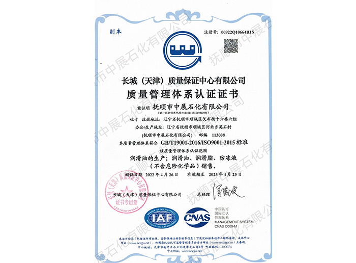 本公司是GB/T19001-2016/ISO 9001:2015標(biāo)準(zhǔn)質(zhì)量體系認(rèn)證單位(注冊(cè)號(hào):00922Q10664R1S),是GJB9001C-2017標(biāo)準(zhǔn)武器裝備質(zhì)量管理體系認(rèn)證單位。撫順在上個(gè)世際五十年代就已是我國(guó)軍用油脂的生產(chǎn)基地,本公司正在發(fā)揚(yáng)和繼承這一優(yōu)良傳統(tǒng),全力投入于各種軍用、航空油脂的生產(chǎn)與研發(fā)。